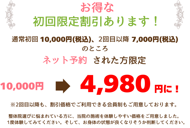 また、病院や整体院を含め、累計5万件以上の施術歴がある院長が必ず施術を担当し、他のチェーン店とは異なる最新の整体法・技術を使い、不調の根本原因を見つけて施術していきます。